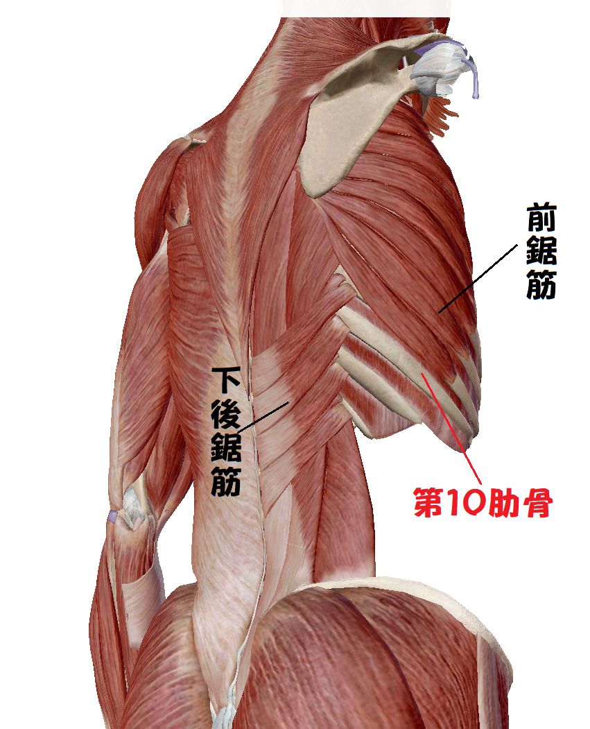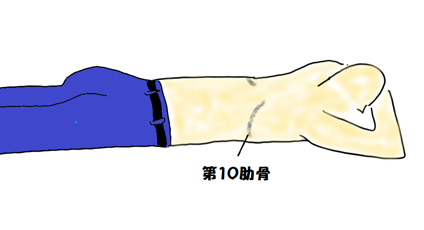 胸郭の横の広がりは第10肋骨の端にあたります。