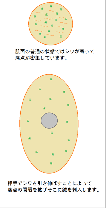 皮膚面をシワのまま鍼を打つより引き伸ばしたほうがその面積あたりの痛点の数は少なくなります。