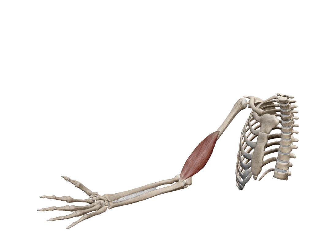 上腕筋は、肘関節を屈曲させる短関節筋です。上腕二頭筋と供に肘を屈曲させる役割がありますが、前腕の回外には関与せず、屈曲に特化しています。
