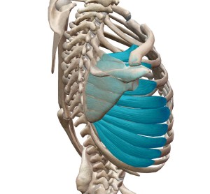 肩甲間部の菱形筋・後鋸筋が肩甲骨を引っ張り さらに前鋸筋が各肋骨を引っ張ることによって胸が開き大きく息を吸うことができます。猫背で胸が縮んでいると呼吸量も少なくなります。