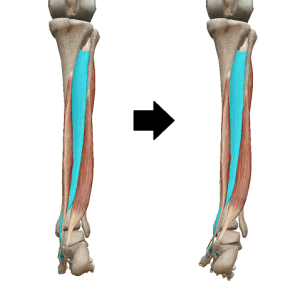 後脛骨筋は最深部にあり可動域は大きくありませんがその収縮によって下腿の静脈血を上に押し上げる役目があります。動きが悪くなると下肢の血流が悪くなり冷え性・むくみの原因になります。