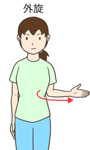 - 外旋テスト:肘を90度に曲げ脇から離さないようにして外側に開きます。これができるのならまだ軽度であり当院では五十肩に入れていません。