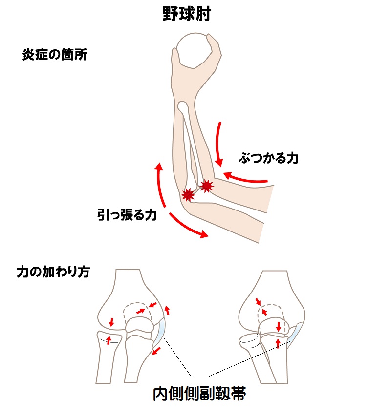 内側側副靭帯が繰り返し引っ張られることで炎症が起きます。