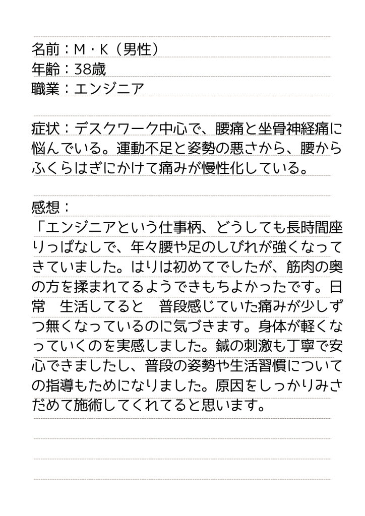 問診や施術中の会話で生活の中に潜む原因を一緒に探っていきます。例えば、デスクワークなら「長時間座りっぱなし」が原因の一つになり 「無意識に脚を組む癖」など、症状を引き起こす行動が日常に潜んでいることも少なくありません。