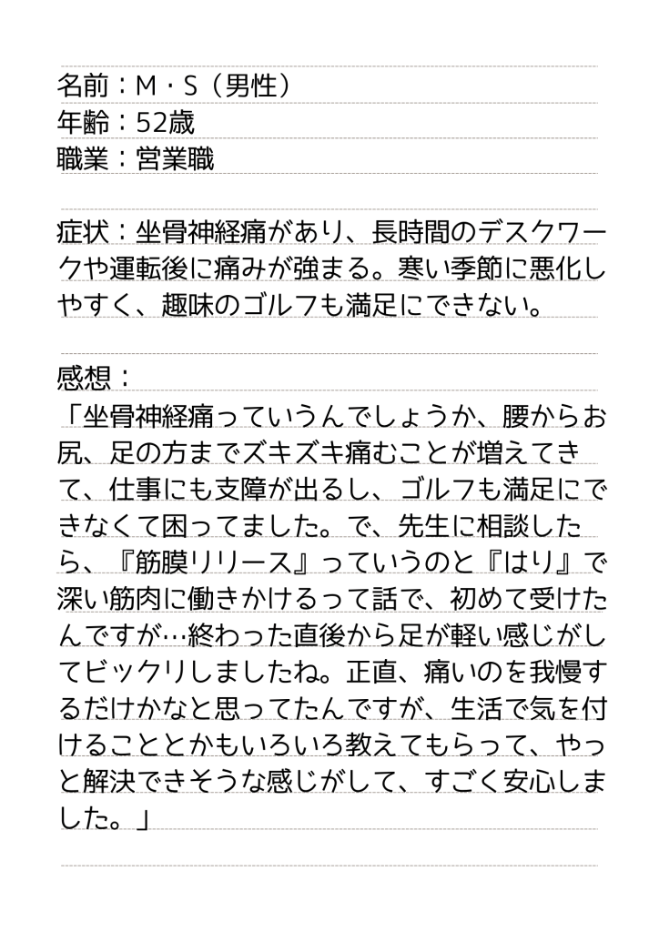 ✅ お尻の痛みが原因で趣味のゴルフを楽しめなくなり、ストレスが溜まっている