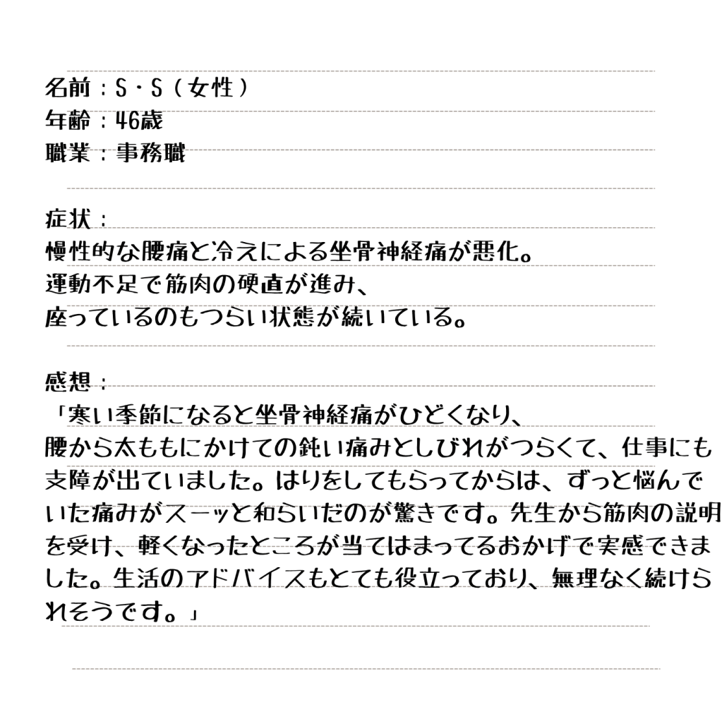 特に「夏場には症状が出ず、冬の寒さで痛みが始まる」場合は、神経根性ではなくお尻から脚にかけての筋肉の硬直が原因の可能性が高いです。