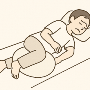 寝方 は、仰向けでクッションを膝下に入れて軽く曲げる、あるいは横向きで膝をクッションの上にのせるようにすると腰への負担が減ります。