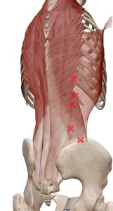 痛みの場所で一番多いのは腰方形筋上です。起始部・停止部 腸肋筋との重なりの部分などです。